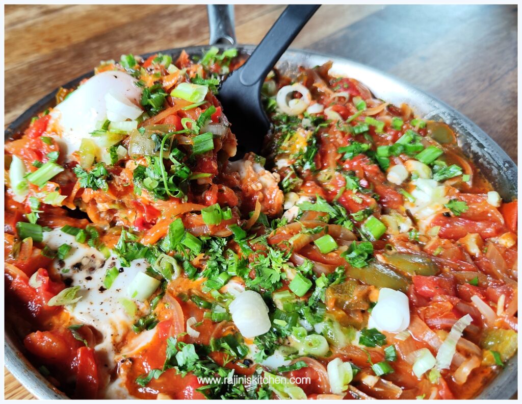 - Using a tablespoon make 6 holes in the tomato mix. Drop in some grated cheese, gently crack an egg(without messing the yolk) over the cheese in each of those holes. Sprinkle on some salt, rest of the pepper and herb mix. Cover the pan with a well fitting lid and allow the eggs to cook to a consistency (runny, slightly runny, firm) of your liking.