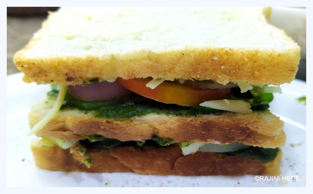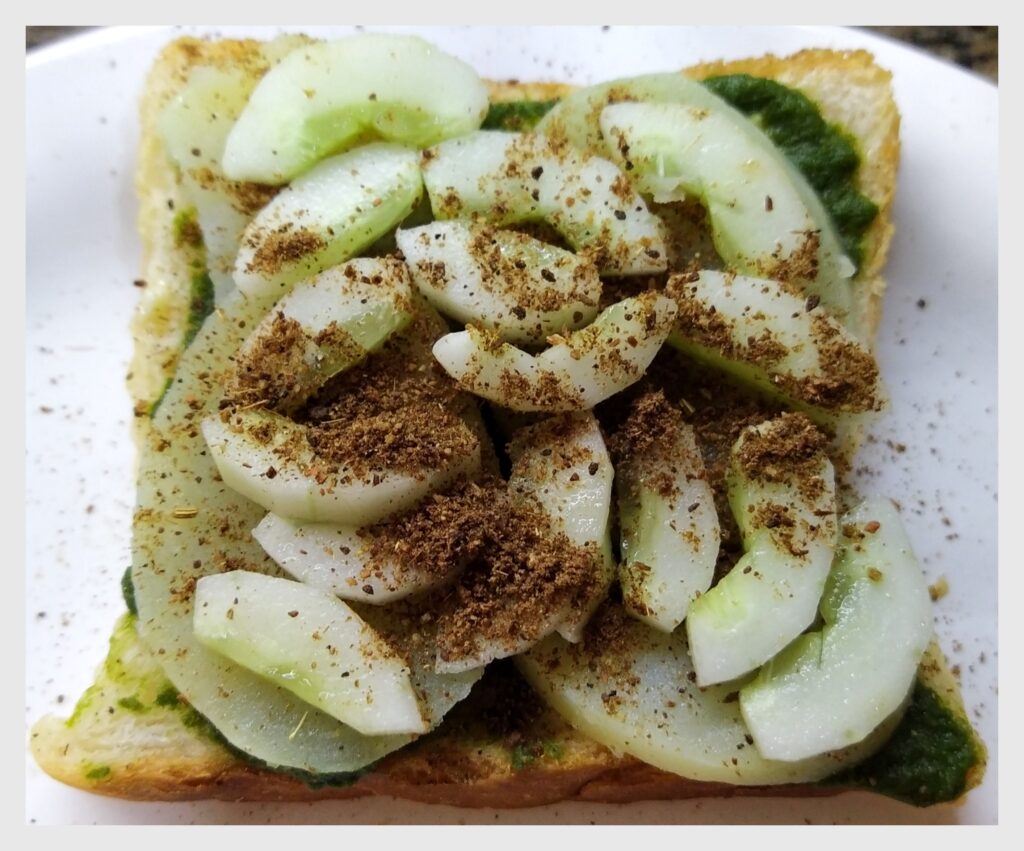 - Place cucumber slices over it followed by Masala and top up with another slice of bread (slice2), buttered chutney side down. (2)
