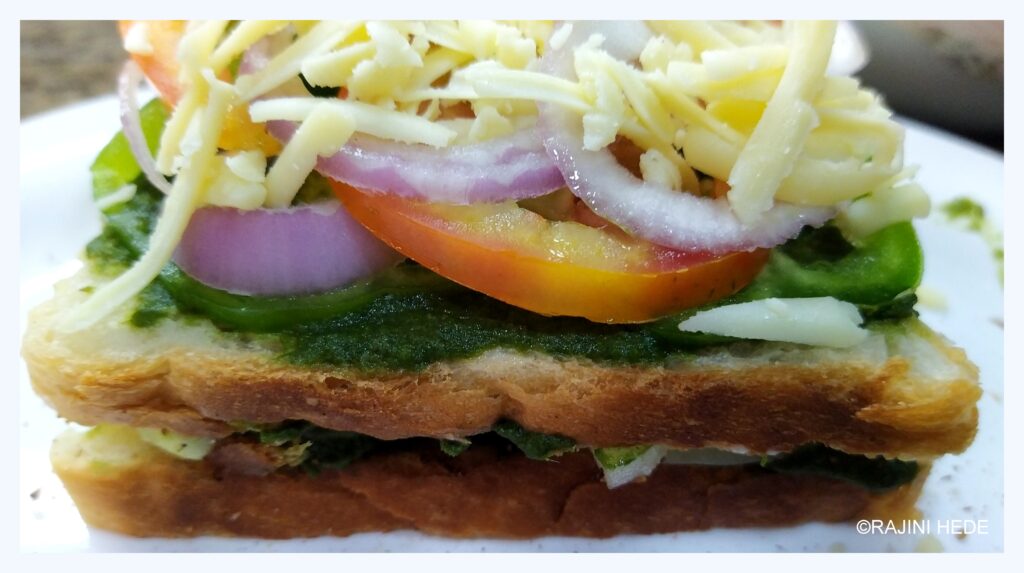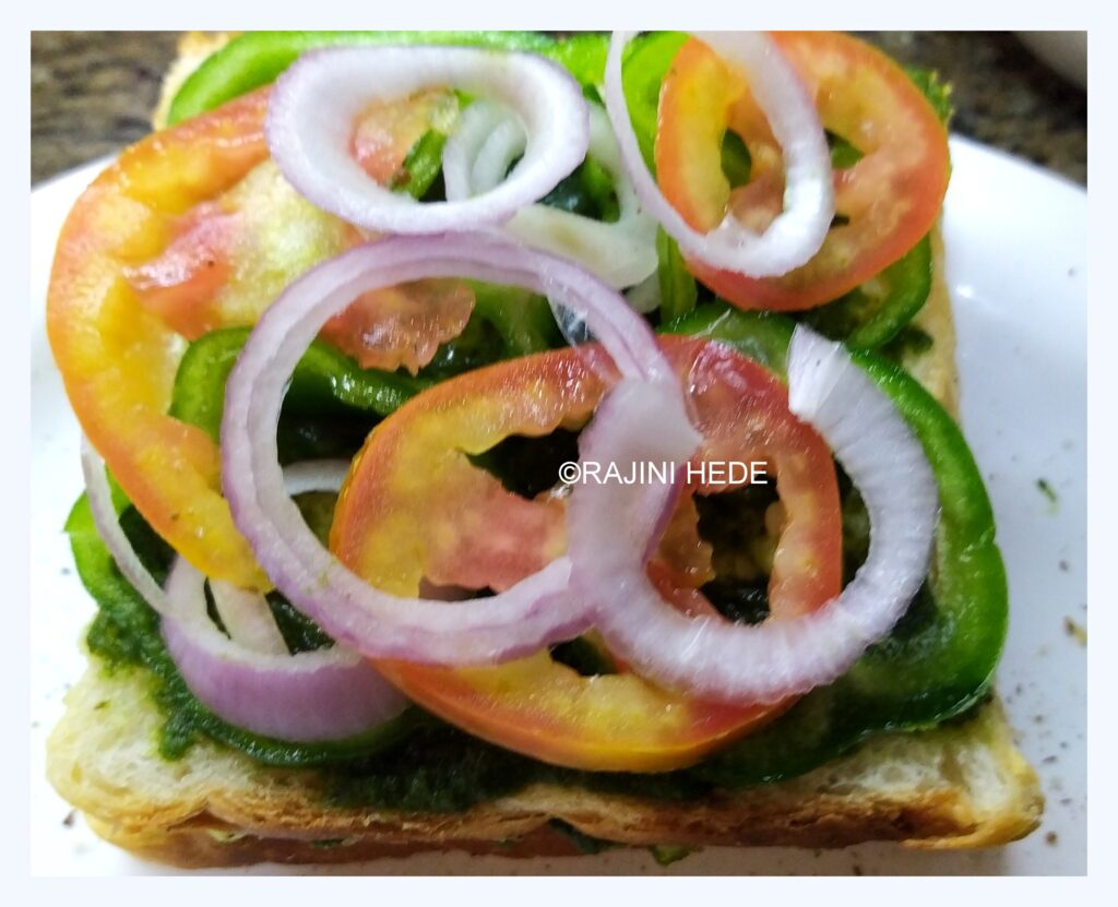 - Slather on some more butter and chutney on top of slice 2. Place a couple of slices of tomato, capsicum, onion and sprinkle on some Masala. (3)