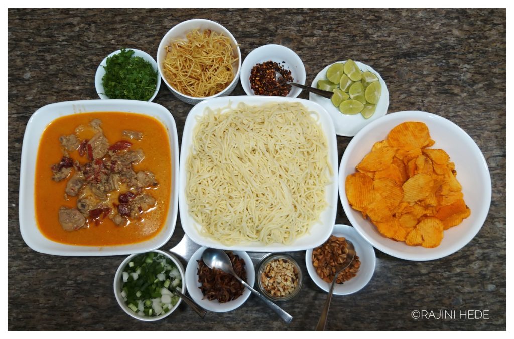 - An alternative to using whole red chillies (if you don’t like having to fish them out of the Khao Suey as you eat, although they do add to the appearance of the dish) is to grind 8 Kashmiri dry red chillies with half the ginger garlic, to a fine paste in ¼ cup of palm vinegar and follow the rest of the method as above. You can also add ½ teaspoon of dry shrimp while grinding the paste.
