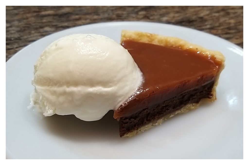 - After 25 minutes, cool the pie to room temperature and refrigerate for about an hour until the top feels cool. Next, pour the caramel sauce over the chocolate filling, using a spatula to spread it in an even layer.
