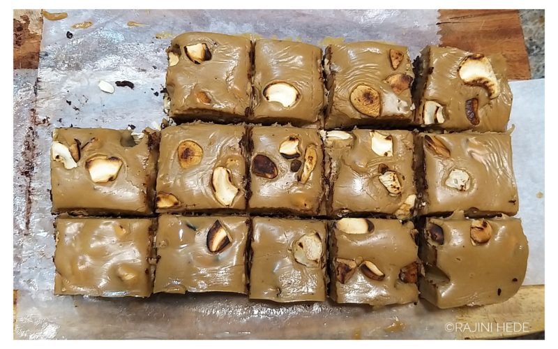 - After an hour, pull out the fudge from the tin, dip a knife in hot water, wipe clean and cut the fudge into even squares. (Don’t expect this to be easy. By the time you pull the fudge out of the tin impatience will very likely get the better of you)