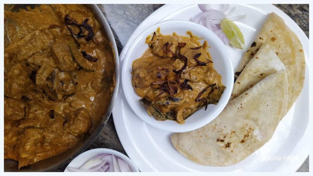 - Serve garnished with the remaining fried onions, lime wedge and naan/roti.