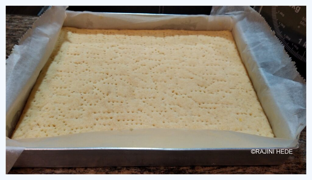 - Randomly poke holes all over the base and bake in the centre of a preheated oven at 160°C for 40 minutes or until the top turns a very light brown.