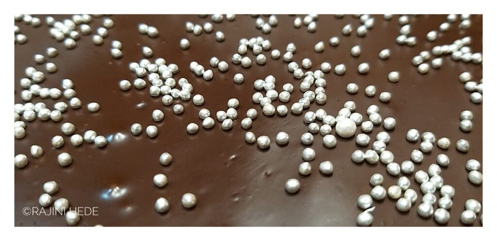 Pour melted Drak chocolate over the chilled Caramel Fudge Drop tiny silver sprinkle’s while the chocolate is still molten