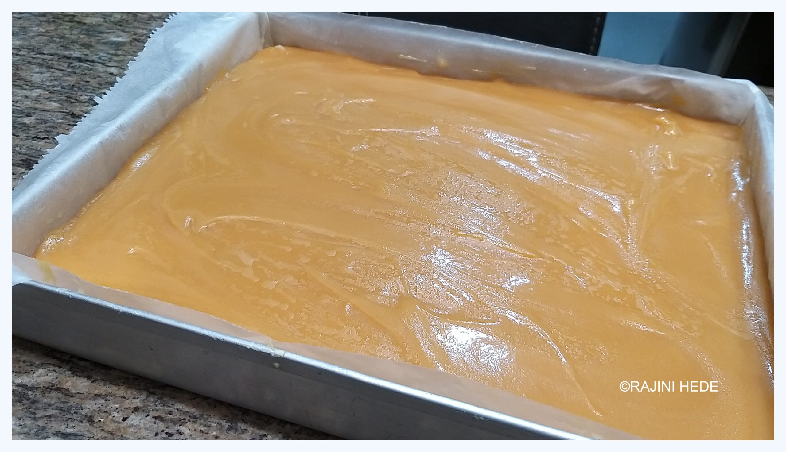 - Pour this Caramel Fudge over the Base layer in the tray and set aside to cool completely.