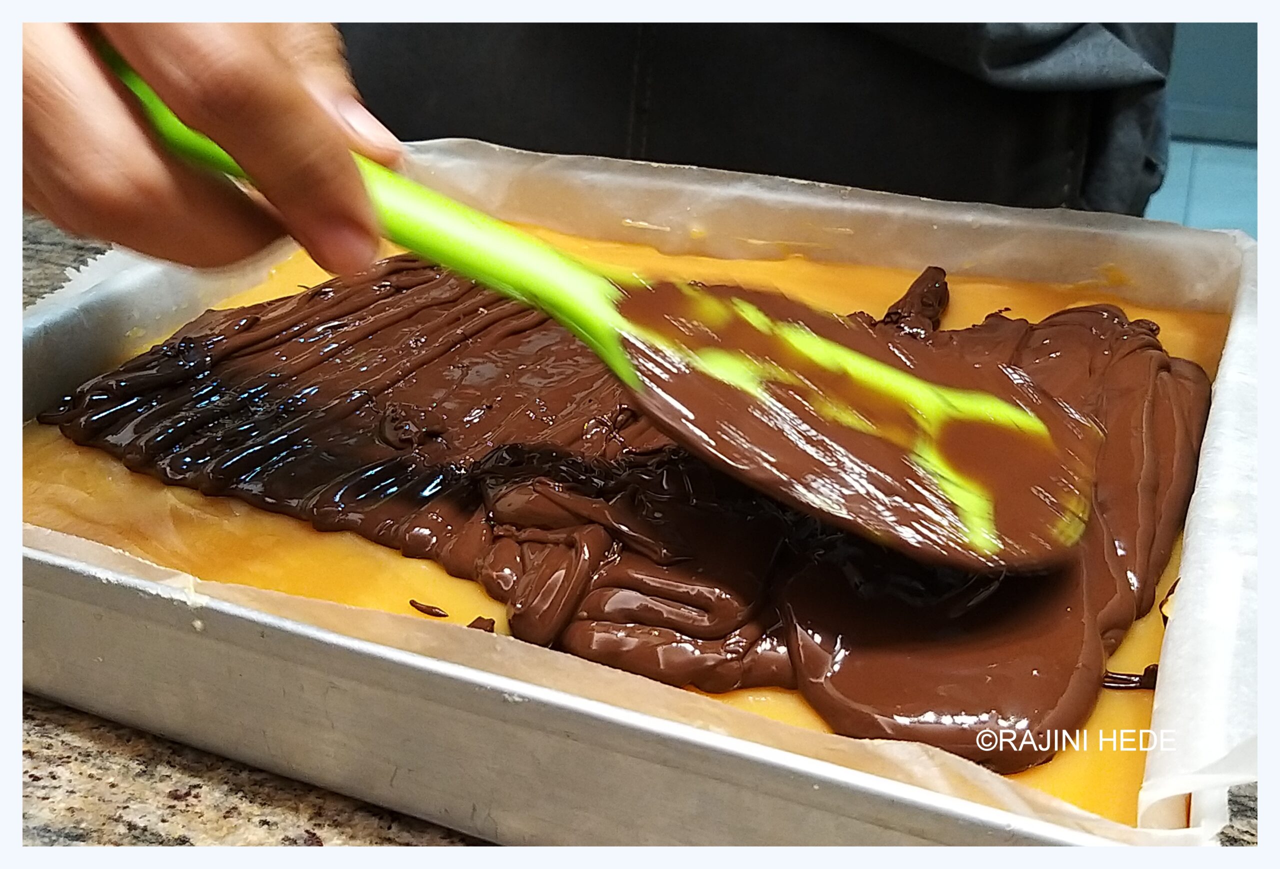 - Pour right away on to the chilled Caramel Fudge layer, using a spatula spread it as evenly as possibly.
