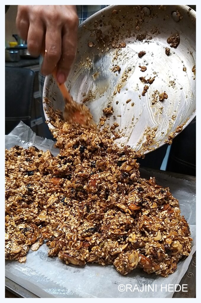 - Add in the roasted grain, nuts, seeds, raisins and cardamom powder. Mix well ensuring that they are well coated with the melted jaggery.