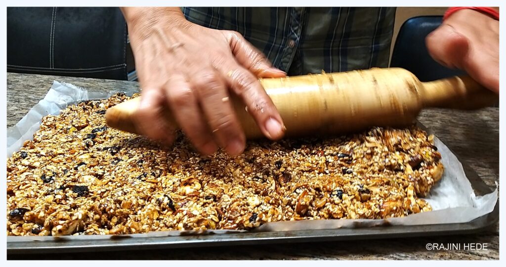 - Allow the jaggery coated muesli to cool completely before cutting it into bars.
