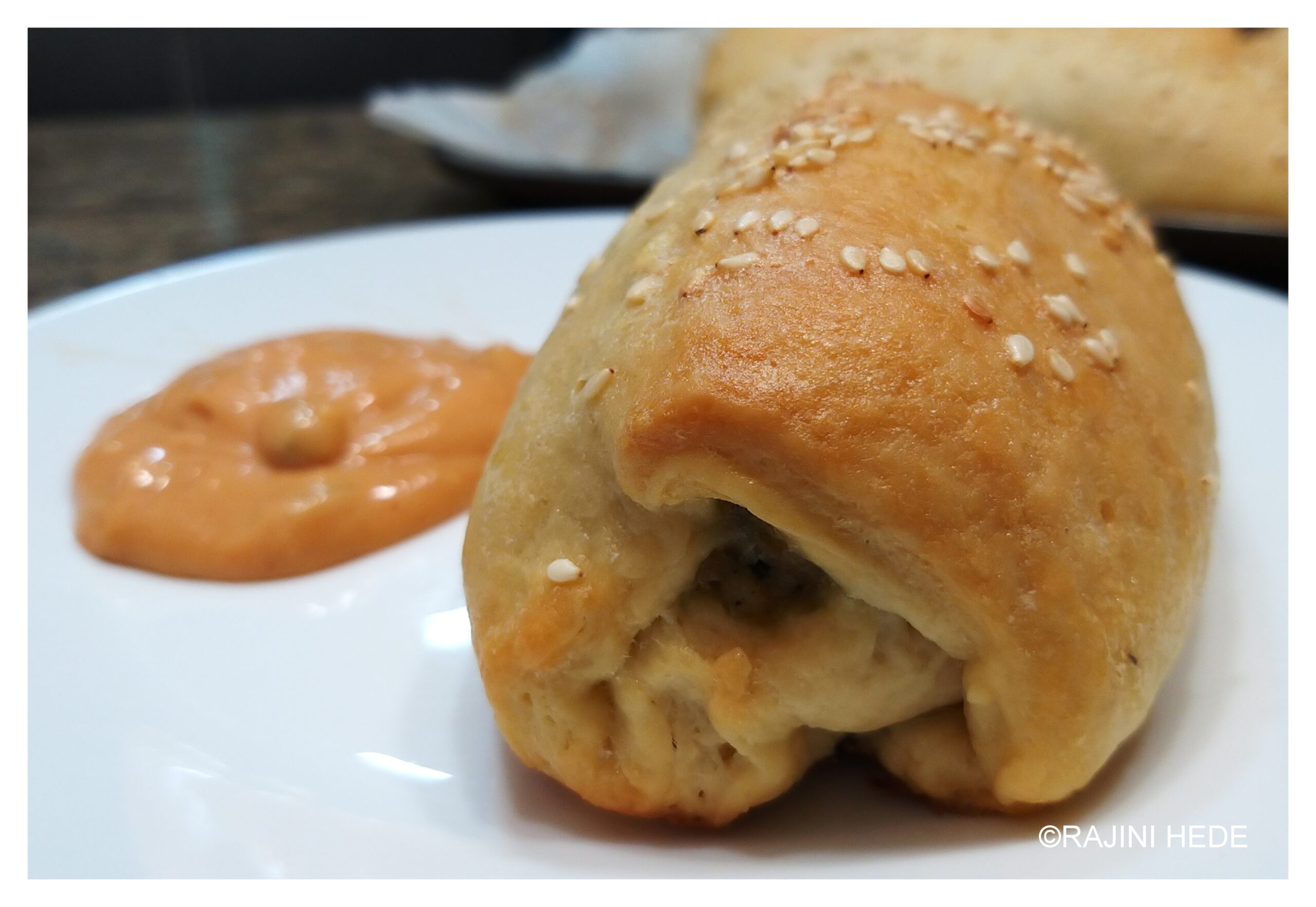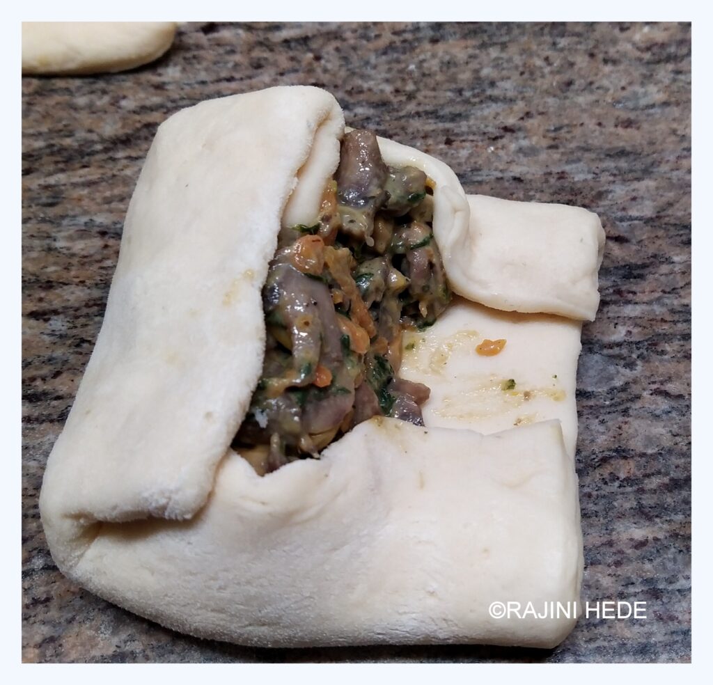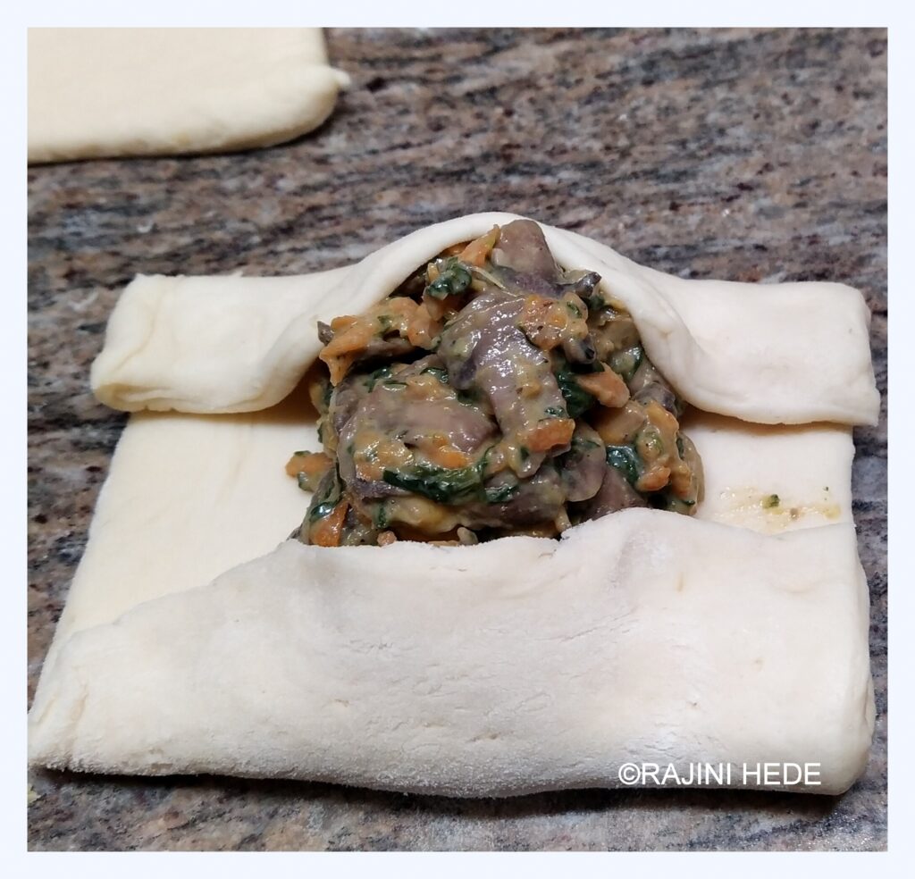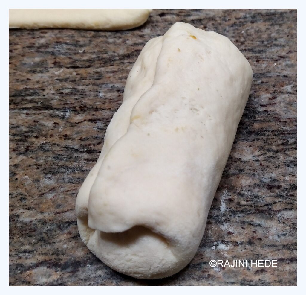 - Place about 1- 2 tablespoons of the filling along the middle of each rectangle leaving enough for an overlap all around. Fold the sides over and roll the dough into a cylindrical shape.