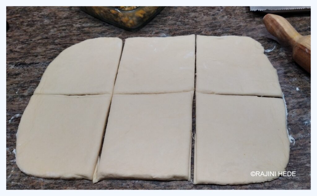 - After 2 hours roll out the dough into a 10″ x 18″ rectangle. Cut into 6 more or less equal rectangular pieces.