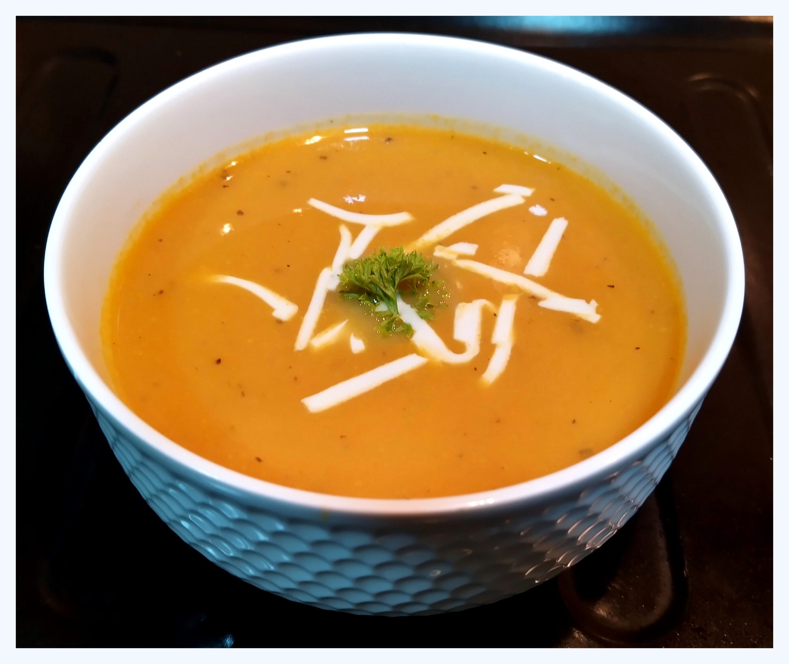 - Before serving warm the pureed soup, stir in the milk/ cream. Garnish with grated cheese and chopped parsley leaves.