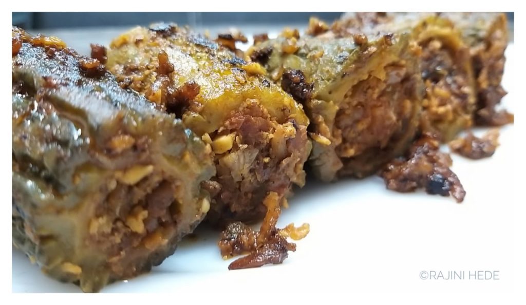 • To a shallow pan with a well fitted lid, add the stuffed bitter gourds and gently (so as not to mess the stuffing in the bitter gourds) pour in 2 cups of water. Cover and cook, adding water if it dries up, until the bitter gourds are well done and soft. You should be left with no water in the pan.