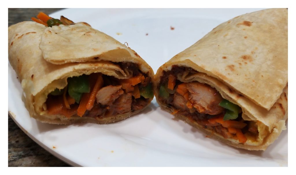 • Place a frankie wrap on a plate, spread some of the chicken szechuan in a straight line across the diameter of the frankie wrap and top it with salad. Roll up the frankie with the salad and chicken tightly wrapped so that nothing falls out.